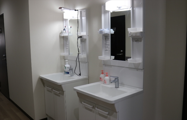 ▲洗面台も新しいくてピッカピカ♪共同スペースではありますがみんなで協力し清潔感を保っています。その他、冷蔵庫・電子レンジ・洗濯機・キッチン・トイレ・シャワールームも共同で使い放題!