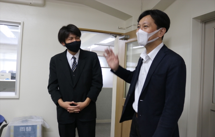 ▲社内入口直後にしっかり検温器!写真で分かるようにシートも徹底されているので感染症対策はバッチリですね!と、関心していると、武士(たけし)室長が出迎えに来てくれました!