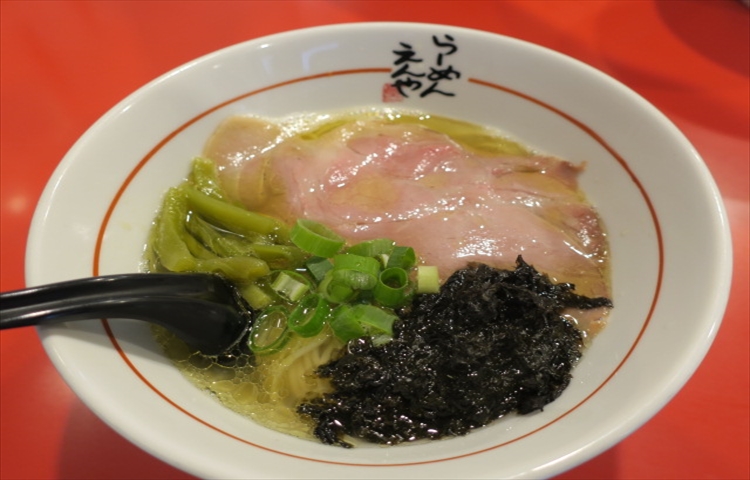 ▲こちらが人気№1メニューの塩らーめん(800円)。レアチャーシュー、岩海苔、ねぎ、山くらげがトッピングされた、シンプルな塩らーめんです!