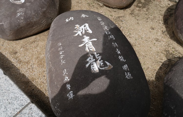 門傅さん:これは「力石」と呼ばれています。昔、櫛田神社では卯日相撲が盛んに行われていて、多くの有名力士が力自慢に持ち上げた石を奉納しているんですよ。ちなみにこれは朝青龍が持ち上げた力石です!!