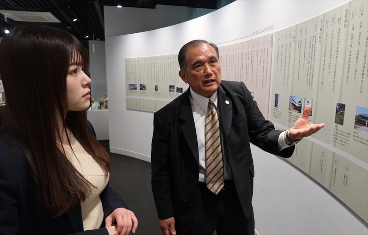 門傅さん:ここでは博多の古代から現代まで約2000年の歴史を年表で紹介しています。那珂川と石堂川にはさまれた「博多」は、古代から日本の西の門戸として大陸と密接につながり、外国船の出入りする貿易港として栄えていたんですよ。