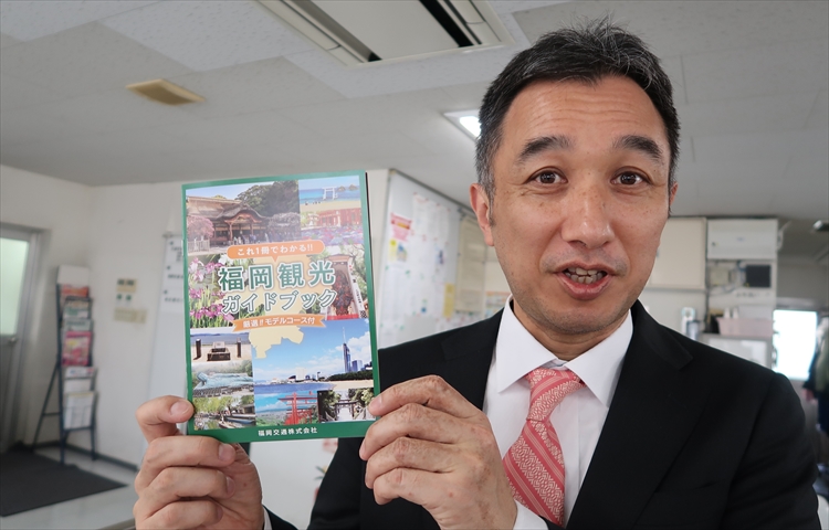 ▲野上専務がお持ちの福岡観光ガイドブック!実は福岡交通さんが発行しています!福岡市内の全てのホテルに設置されている為、観光仕事の依頼がたくさん入ってくるんです!