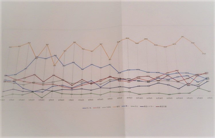杉本社長:これは米子市内のタクシー会社でタクシーチケットの売上がどのくらいかデータにした物です。一番上にある線が当社です。ここ数ヶ月は第二位の会社にダブルスコアを付けるくらい、皆生タクシーがずば抜けています。タクシーチケットのみならず無線配車の本数も米子市内では当社が№1です。