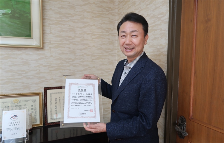 杉本社長:こちらが「健康経営優良法人」の認定証です。健康経営優良法人認定とは《従業員の健康管理を経営的な視点で考え、戦略的に取り組んでいる法人》として認められた企業に送られる賞です。