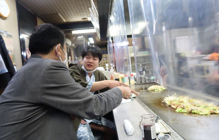 杉本社長:ここはお好み焼き屋だけどさ、モツ焼きが本当に美味しいんだ!日本一だよ!本当に!感染対策のフィルムもバッチリですから、安心して美味しくいただきましょう!