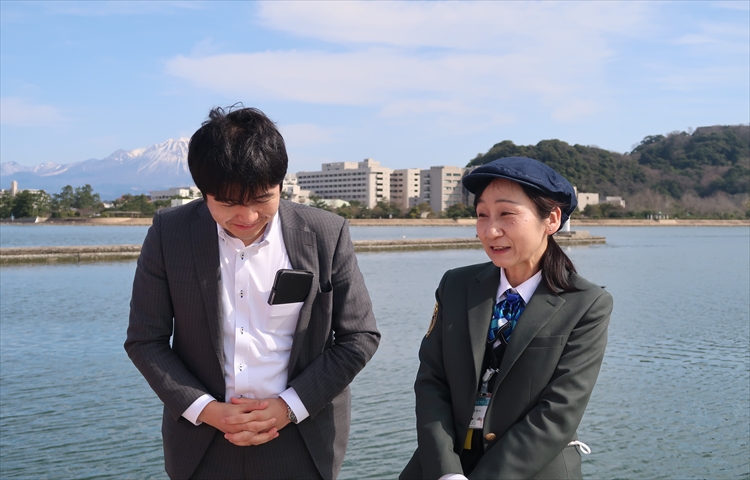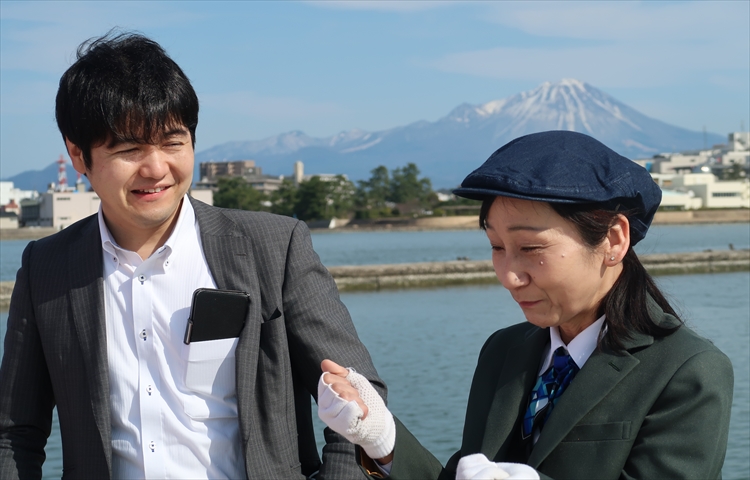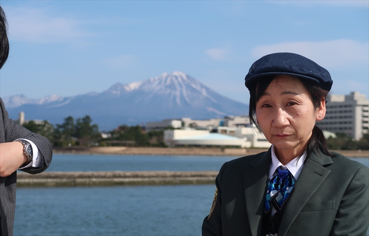 ▲という事で、皆生タクシーさんから車で1分の場所にある港に到着です。後ろにそびえたつ中国地方最高峰の「大山」をバックにインタビューを開始します!