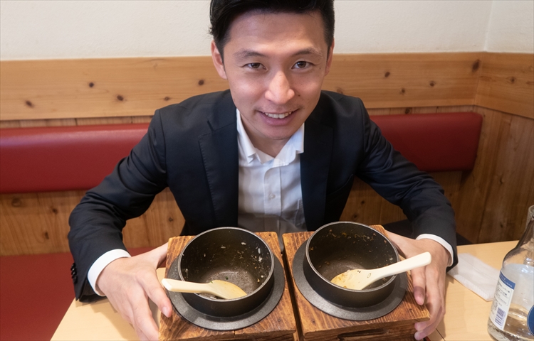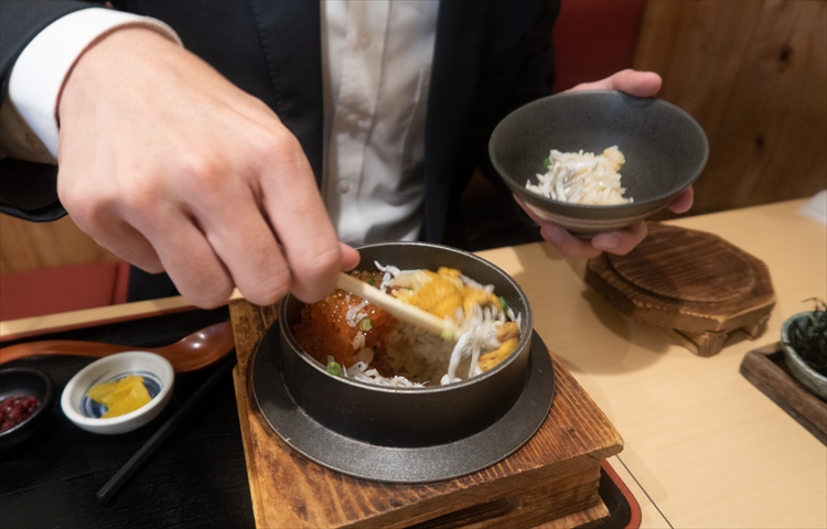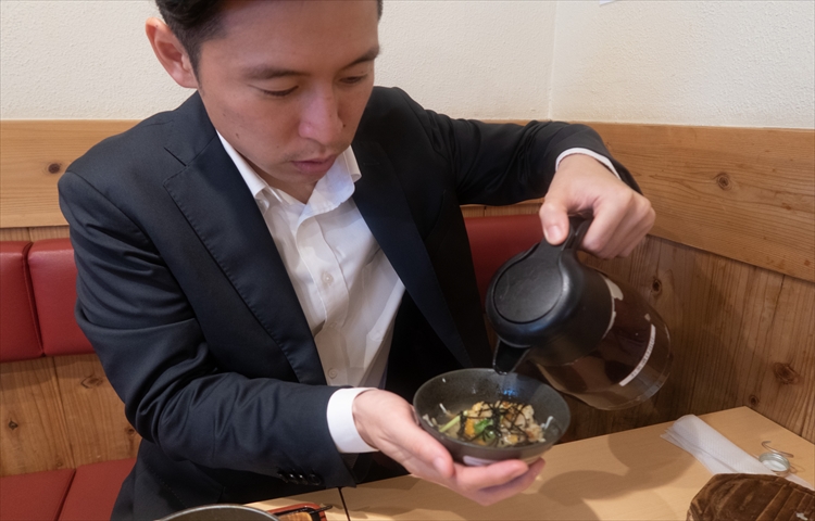 ▲おこげも入った最後の1杯は、ダシを注いでお茶漬けに。