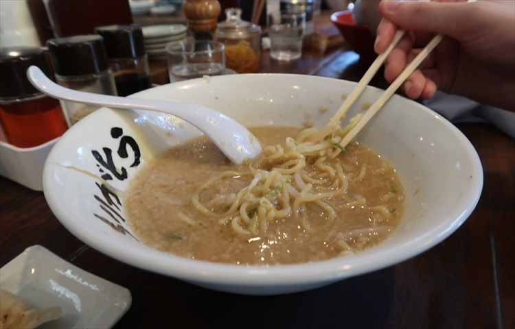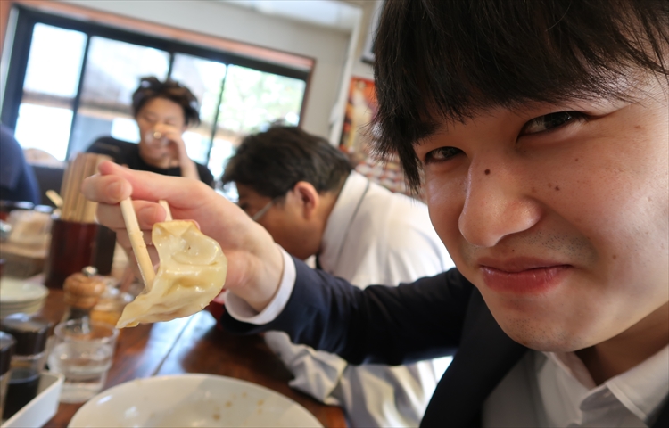▲ラーメンをすすりながら、餃子も忘れません!ぷりっぷりのもっちもっちです!持ち上げただけでわかります…!