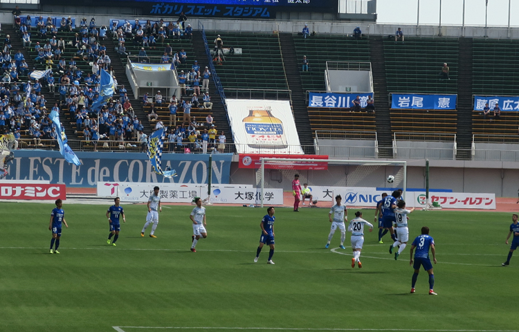 ▲ゴール裏のサポーター席に陣取ります。やっぱり、整備された緑の芝と青空のコントラストは最高!