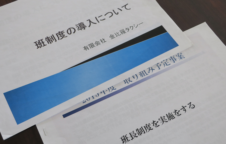 ▲こんな資料が机の上に・・・。そうかー、金比羅タクシーでは班制度を取り入れているんですねー。これであれば、新人で右も左もわからないドライバーさんも安心して覚えられますね!相談できる仲間が近くにいるって、本当に安心できますよね。