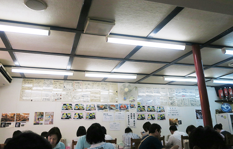 ▲店内に入ると、開店してから間もないと言うのにこの賑わい!有名芸能人が多数訪れている名店らしく、大量のサイン色紙が飾られてあります。