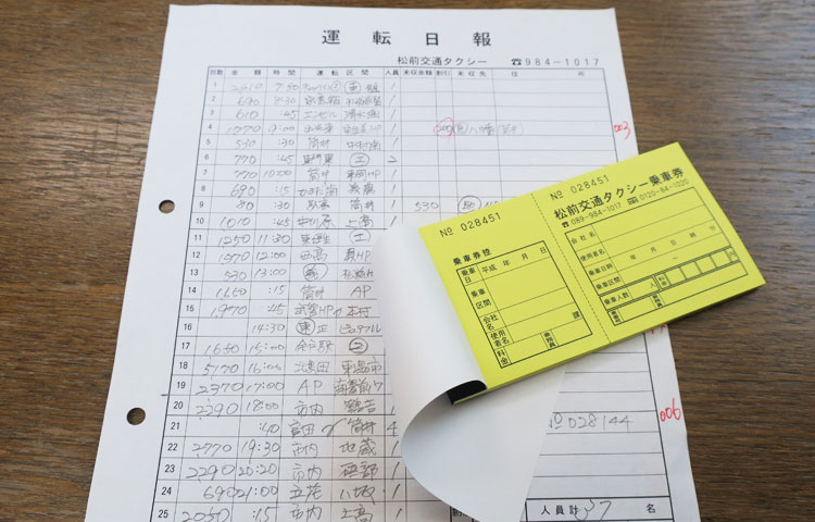 堀川さん:これは1日の日報です。1枚では収まらないのでこれは一部分ですが、左の欄を見ると引っ切り無しにお客様をお乗せできている事がわかりますよね?これが殆ど無線配車からなんです。自ら流して営業しなくてもちゃんとこのようにお客様をお乗せしております。また、黄色いカードは松前交通タクシー専用の乗車券です。このエリアはこの専用乗車券をお持ちの方が多いので、必然的に松前交通タクシーを選んでくれます。