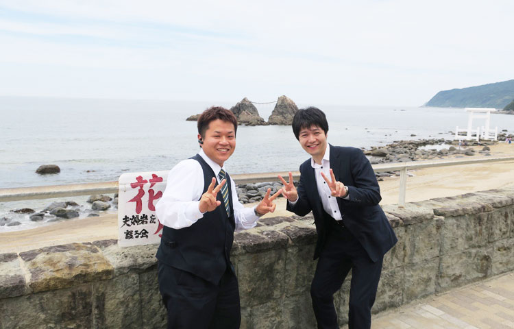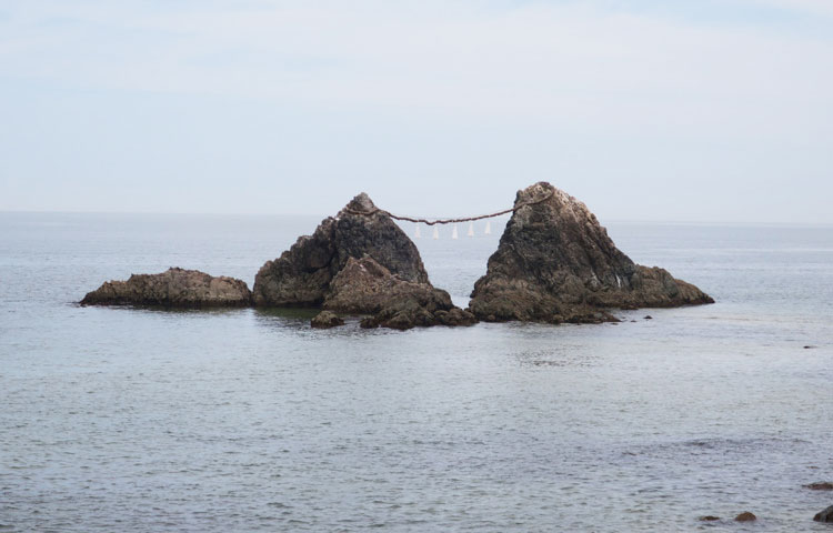 ▲二見が浦の「夫婦岩」。夫婦で仲良くそびえ立つその姿に、夫婦円満を祈願する夫婦も多いとの事。