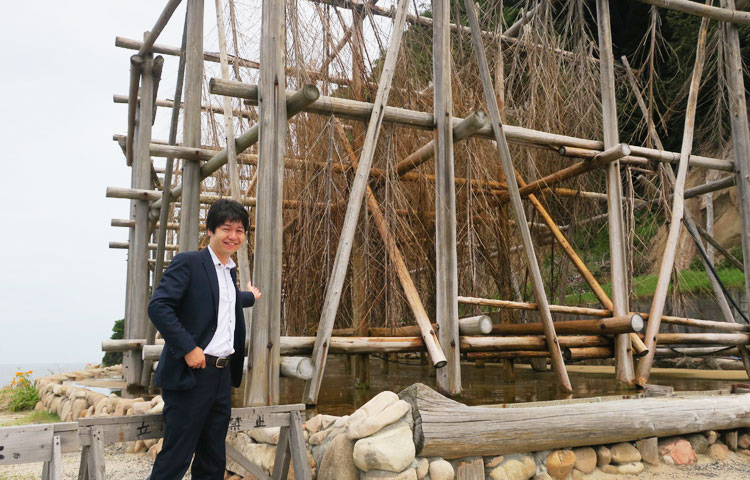 ▲こちらで海水をくみ上げているそうです。この立体塩田の上から竹を伝わせて、ゆっくり10日間循環させているそうです。