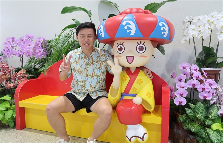 ▲続いては沖縄観光PR大使キャラクター、花笠マハエちゃんと記念撮影!空港にいるだけもう楽しいですね!