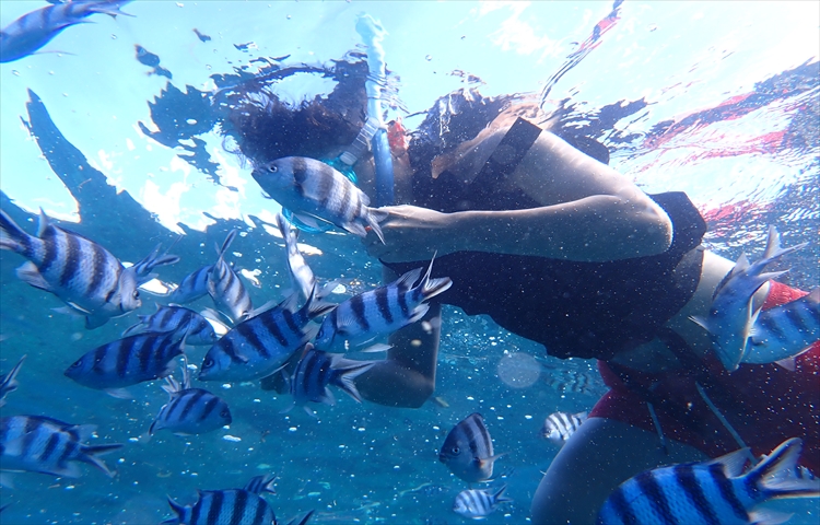 ▲餌やり体験もできちゃいます!気づけば餌を求めた魚に囲まれていました(笑)