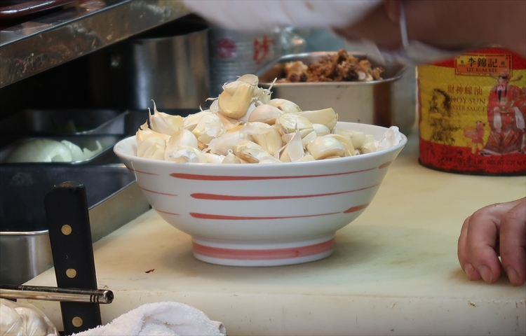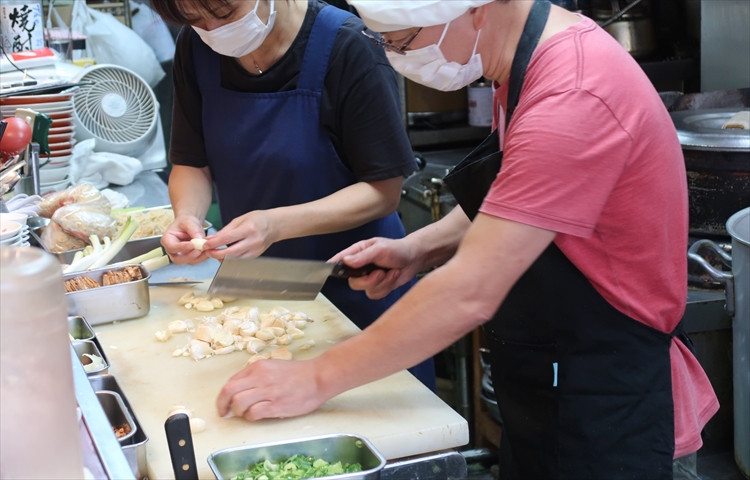 ▲早速、ニンニク増し増しチャーハンの調理開始です!僕以外にも同じメニューを注文するお客様が複数いらっしゃってまな板の上はニンニクだらけ(笑)